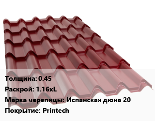 Металлочерепица 0.45 1.16хL Марка: Испанская дюна 20 Покрытие:Printech, м2, RAL цена от 1 004 Р / м2, где купить, условия доставки в Могилеве и Могилёвской области