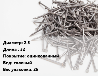 Гвоздь 2.5х32 оцинкованный толевый 25, кг цена от 117.54 Р / кг, где купить, условия доставки в Могилеве и Могилёвской области
