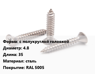 Саморез с полукруглой головкой D=4.8 L=35 сталь RAL 5005, упаковка 1000 шт цена от 2 715 Р / кг, где купить, условия доставки в Могилеве и Могилёвской области