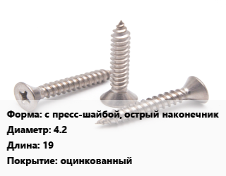 Саморез с пресс-шайбой, острый наконечник D=4.2 L=19 оцинкованный