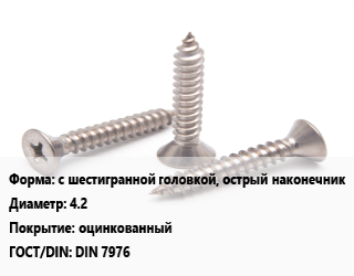 Саморез с шестигранной головкой, острый наконечник D=4.2 оцинкованный ГОСТ: DIN 7976