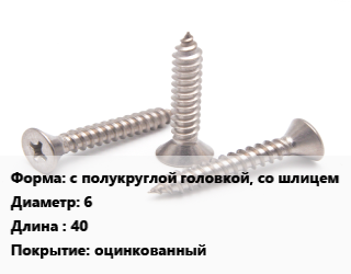 Саморез с полукруглой головкой, со шлицем D=6 L=40 оцинкованный, кг цена от 883.38 Р / кг, где купить, условия доставки в Могилеве и Могилёвской области