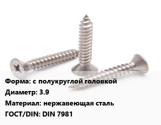 Саморез с полукруглой головкой D=3.9 нержавеющая сталь ГОСТ: DIN 7981
