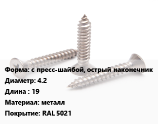 Саморез с пресс-шайбой, острый наконечник D=4.2 L=19 металл RAL 5021, упаковка 450 шт цена от 497.7 Р / кг, где купить, условия доставки в Могилеве и Могилёвской области