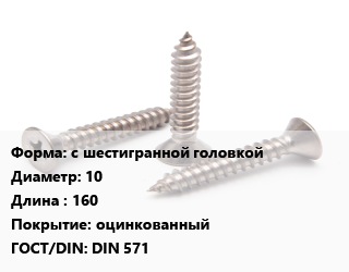 Саморез с шестигранной головкой D=10 L=160 оцинкованный ГОСТ: DIN 571, кг, для дерева цена от 29.7 Р / кг, где купить, условия доставки в Могилеве и Могилёвской области