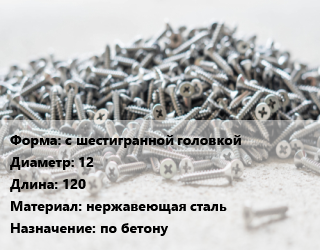 Шуруп с шестигранной головкой 12х120 нержавеющая сталь по бетону, упаковка 1000 шт цена от 489.6 Р / кг, где купить, условия доставки в Могилеве и Могилёвской области