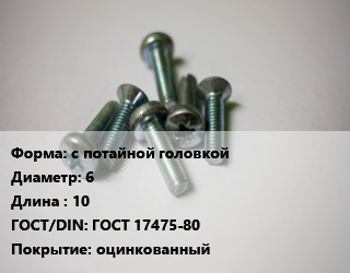 Винт с потайной головкой 6х10 ГОСТ 17475-80 оцинкованный, упаковка 1000 шт,упаковка 5 кг, кг цена от 239 Р / кг, где купить, условия доставки в Могилеве и Могилёвской области