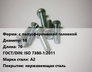 Винт с полусферической головкой 10х70 ISO 7380-1:2011 Сталь: A2 нержавеющая сталь, цена за шт, кг цена от 136.8 Р / кг, где купить, условия доставки в Могилеве и Могилёвской области