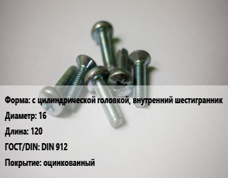 Винт с цилиндрической головкой, внутренний шестигранник 16х120 DIN 912 оцинкованный, 8.8, цена за 1000 шт, кг цена от 161.95 Р / кг, где купить, условия доставки в Могилеве и Могилёвской области