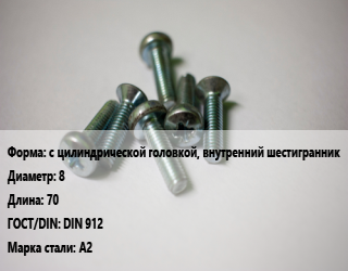 Винт с цилиндрической головкой, внутренний шестигранник 8х70 DIN 912 Сталь: А2, цена за шт, кг цена от 64.24 Р / кг, где купить, условия доставки в Могилеве и Могилёвской области