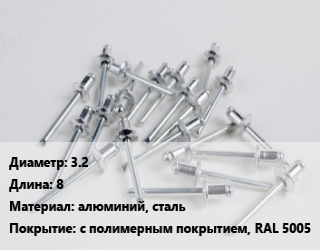 Заклепка 3.2х8 алюминий, сталь с полимерным покрытием, RAL 5005, упаковка, вытяжная цена от 231.82 Р / шт, где купить, условия доставки в Могилеве и Могилёвской области