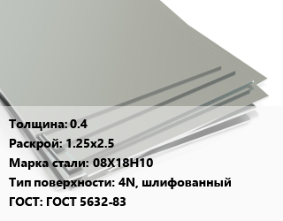 Лист нержавеющий 0.4 1.25х2.5 Сталь: 08Х18Н10 Тип:4N, шлифованный ГОСТ 5632-83