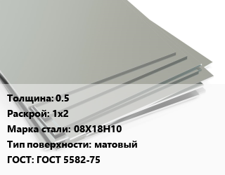 Лист нержавеющий 0.5 1х2 Сталь: 08Х18Н10 Тип:матовый ГОСТ 5582-75