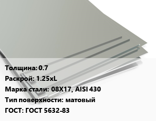 Лист нержавеющий 0.7 1.25хL Сталь: 08Х17, AISI 430 Тип:матовый ГОСТ 5632-83