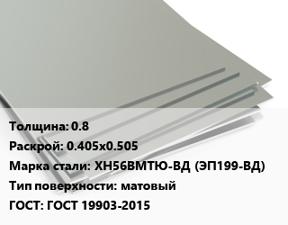 Лист нержавеющий 0.8 0.405х0.505 Сталь: ХН56ВМТЮ-ВД (ЭП199-ВД) Тип:матовый ГОСТ 19903-2015