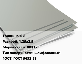 Лист нержавеющий 0.8 1.25х2.5 Сталь: 08Х17 Тип:шлифованный ГОСТ 5632-83