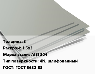 Лист нержавеющий 3 1.5х3 Сталь: AISI 304 Тип:4N, шлифованный ГОСТ 5632-83