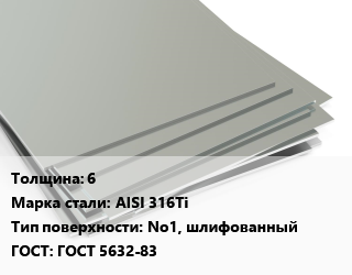 Лист нержавеющий 6 Сталь: AISI 316Ti Тип:No1, шлифованный ГОСТ 5632-83